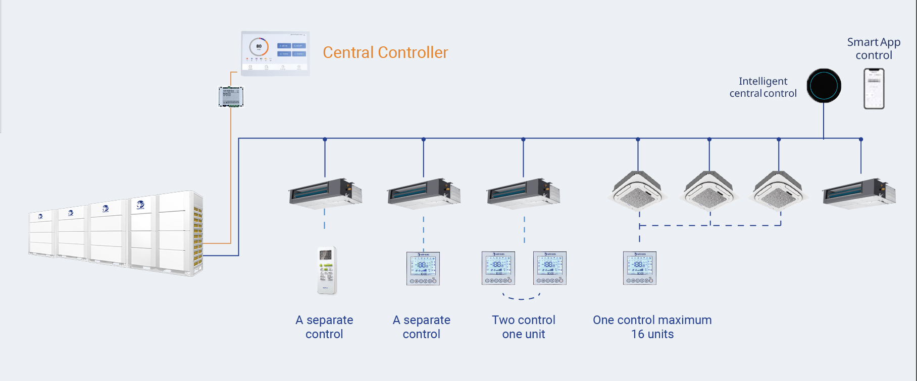 - Up to 16 systems and 1280 indoor units can be connected, easy to set indoor units parameters.